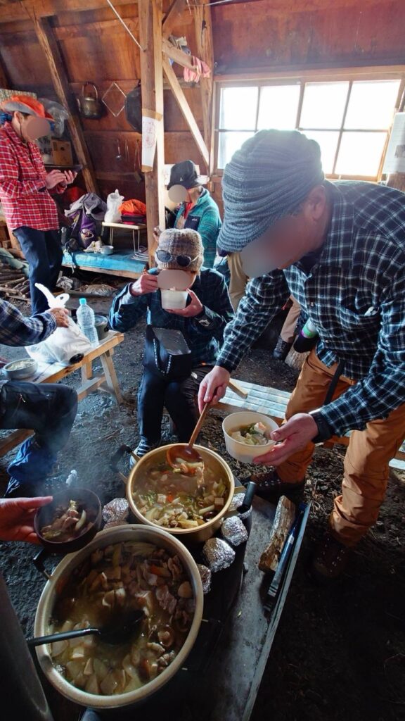 登頂後は小屋へ戻り、食事当番に調理していただいた豚汁をみんなでご馳走に。